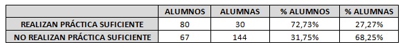 Observamos que únicamente una cuarta parte de las alumnas encuestadas alcanzarían las recomendaciones de tiempo semanal dedicado a la actividad física.